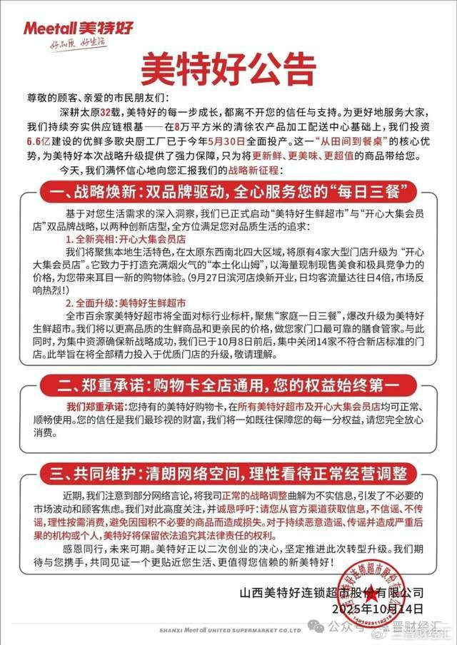 针对这一局面,美特好于10月14日下午发布公告回应,称公司前后集中关闭了14家门店,以聚焦优质门店的升级改造。同时宣布将启动“美特好生鲜超市”与“开心大集会员店”双品牌战略。