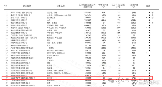 2025年7月,中国连锁经营协会发布《2024年中国超市TOP100》榜单,美特好以65.5亿元销售额位列第27位。