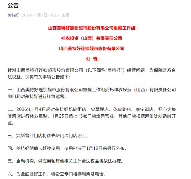 门店运营方面,1月4日起,美特好凯旋街店、尖草坪店、体育路店、康宁街店、开心大集滨河店进行休业重整;1月25日,首批15家门店焕新营业,其他门店根据筹备计划适时开业。
